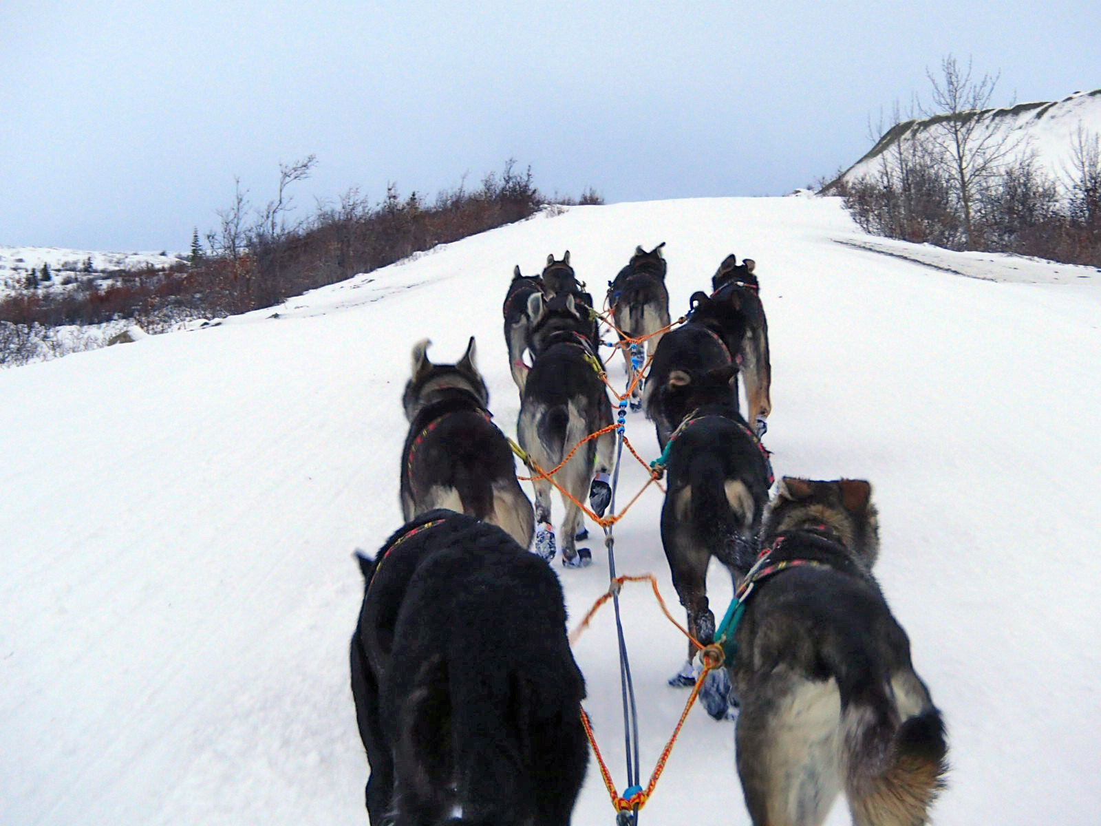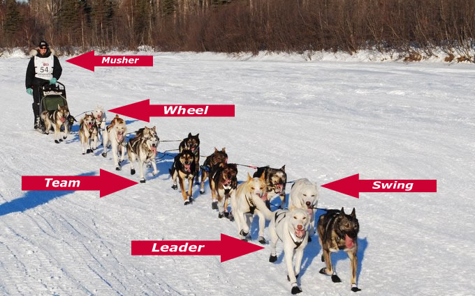 The dog or two dogs in front, who lead the team, are called the leaders. Right behind them are the swing dogs, who help turn the team. Closest to the sled are the wheel dogs, who are generally the largest dogs. The team dogs comprise all the dogs in between the swing and wheel dogs, and provide the team’s momentum and speed.