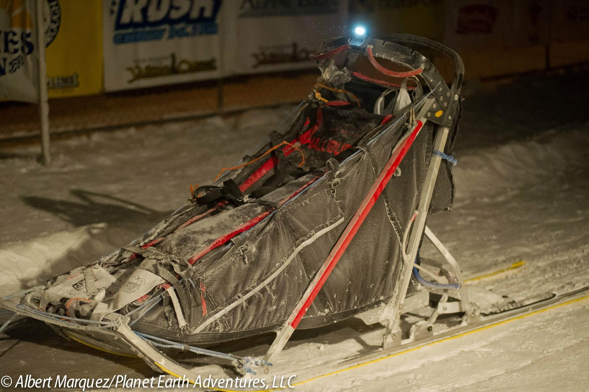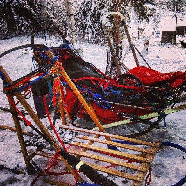 The design and functionality of dogsleds is a complex topic, but the basic equipment involves the sled, harnesses for the dogs, and a gangline, which is the long line running lengthwise between the two rows of dogs and attaching their harnesses to the sled by means of short necklines and tuglines. The sled has a brake and a “parking brake” known as a snowhook. There is much more equipment, especially for long distance mushers, but those are the basics.